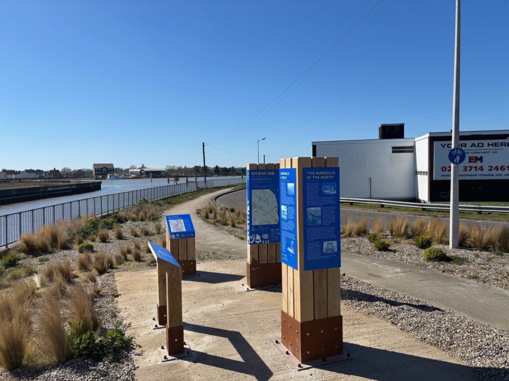 The Discovery Hub consists of a series of oak plinths that can be found adjacent to the railway station and the Bure Bridge entrance to the town. It aims to inform visitors about the history of the Broads and explores themes including the ecology of the Broads National Park, history of the railway, and the history of Great Yarmouth. Maps of the town feature alongside details of three popular walking routes: the Weavers Way, Wherryman’s Way, and Angles Way, which all converge near the station.