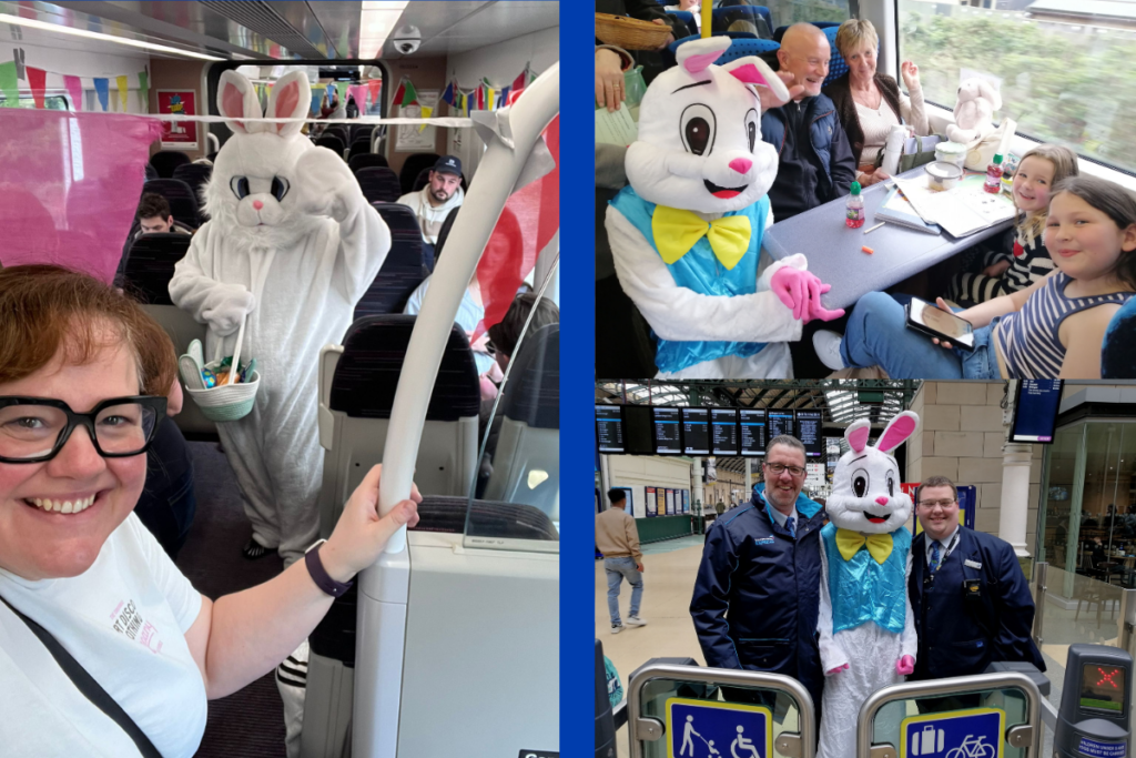On the Yorkshire Coast CRP special train (right), the Easter Bunny handed out chocolate eggs and activity sheets jam-packed with puzzles based on the scenic line, including I-Spy and ‘design your own station’. For the first time, the Easter Train included Brough, Ferriby and Hessle stations in the celebrations, and by the time the train from Hull reached Scarborough, it was packed full of families travelling to the seaside. Passengers even got to say hello to ‘Stormy Stan’, the RNLI mascot who had joined TransPennine Express for a rail and water safety educational event.