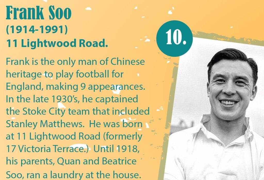 Born at 11 Lightwood Road, Buxton on 8 March 1914, Frank was the first, and remarkably still the only Chinese-heritage footballer to play for England. He made his debut against Wales in 1942 and went on to play for England a further eight times and captained the RAF team during World War II.